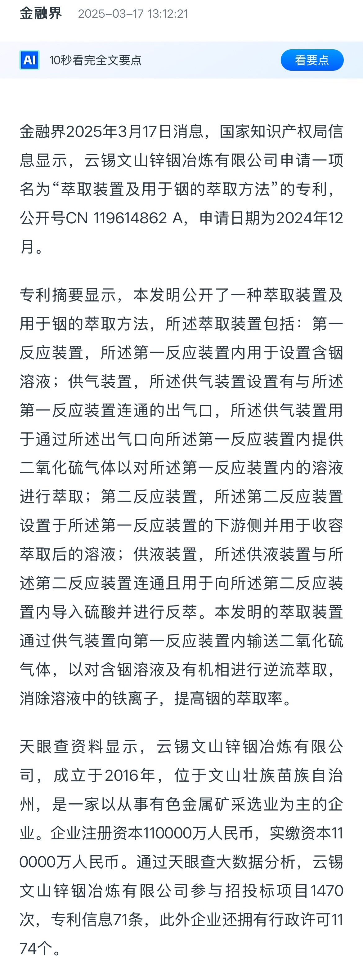 金融界:云錫文山鋅銦冶煉申請萃取裝置及用于銦的萃取方法專利,提高銦的萃取率