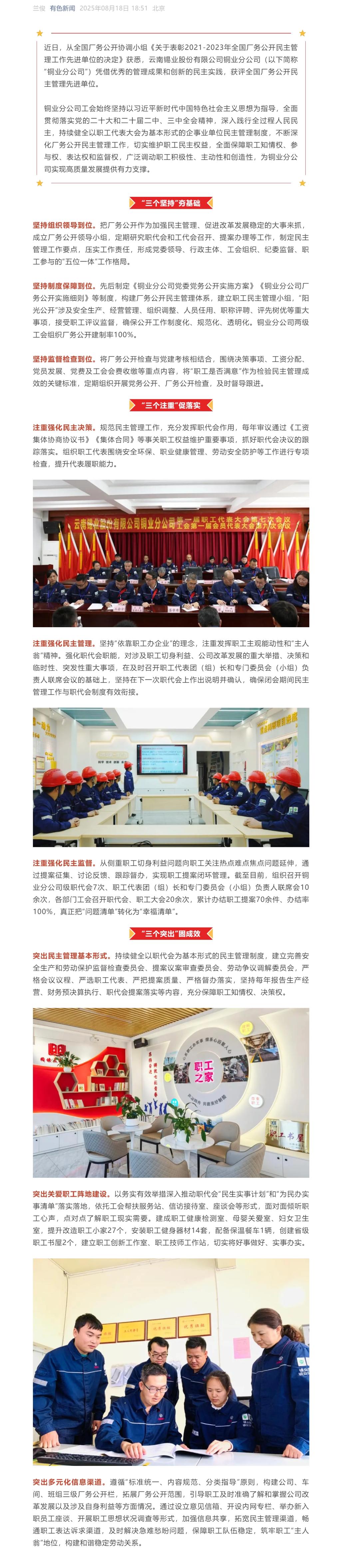 有色新聞、云南政協(xié)報(bào):云錫銅業(yè)分公司獲評(píng)全國(guó)廠務(wù)公開(kāi)民主管理先進(jìn)單位
