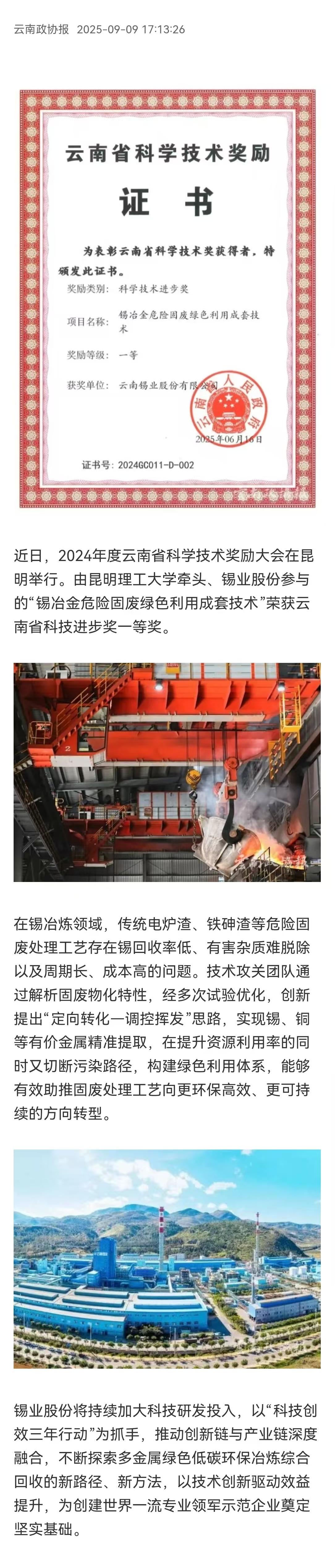 云南政協(xié)報(bào):錫業(yè)股份榮獲云南省科技進(jìn)步獎(jiǎng)一等獎(jiǎng)