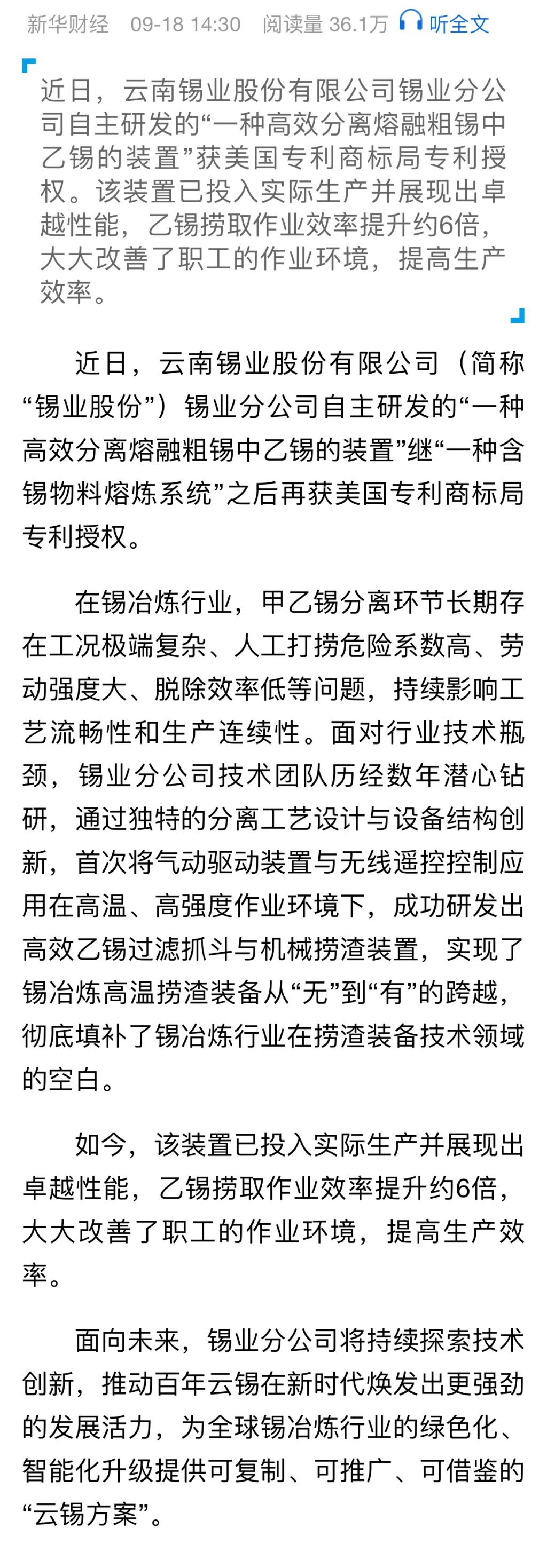 新華財(cái)經(jīng):錫業(yè)分公司創(chuàng)新成果再獲美國專利商標(biāo)局授權(quán)