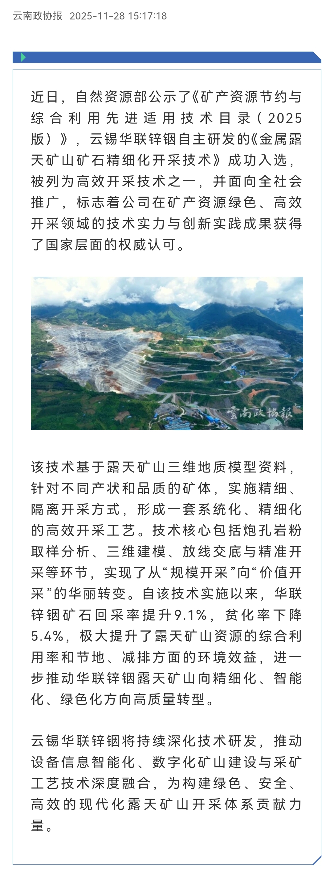 云南政協(xié)報:云錫華聯(lián)鋅銦自研露天開采技術(shù)入選國家先進適用技術(shù)目錄
