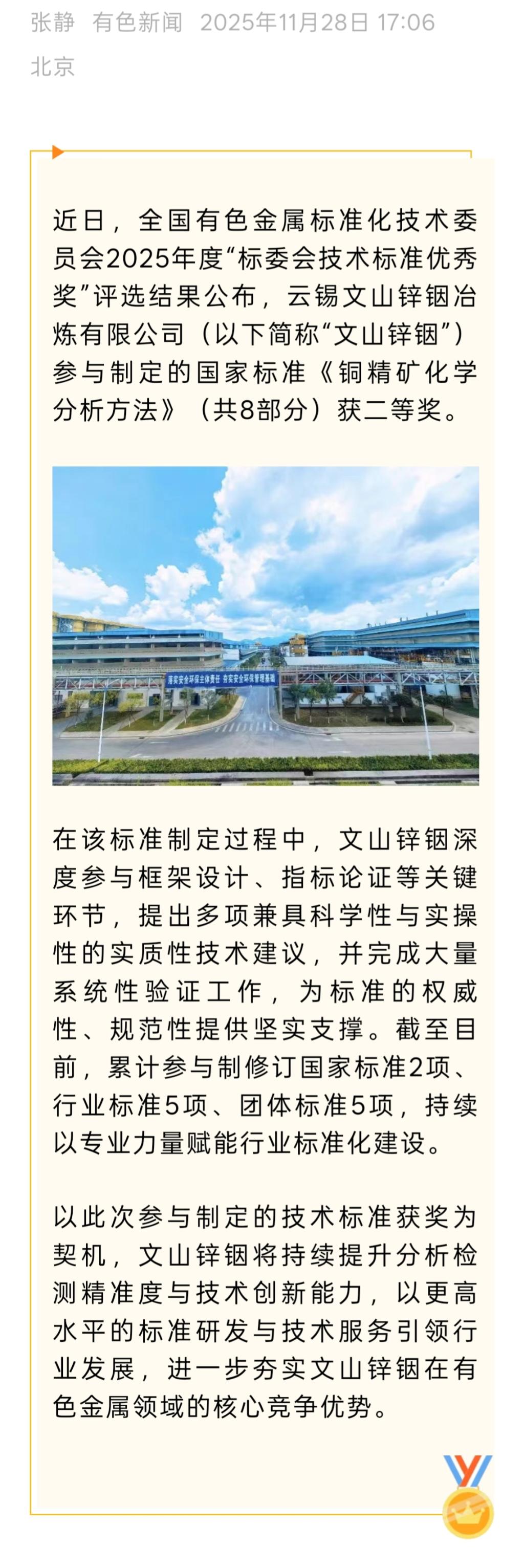 有色新聞:文山鋅銦參與制定的行業(yè)標準榮獲全國有色標委會技術標準優(yōu)秀獎