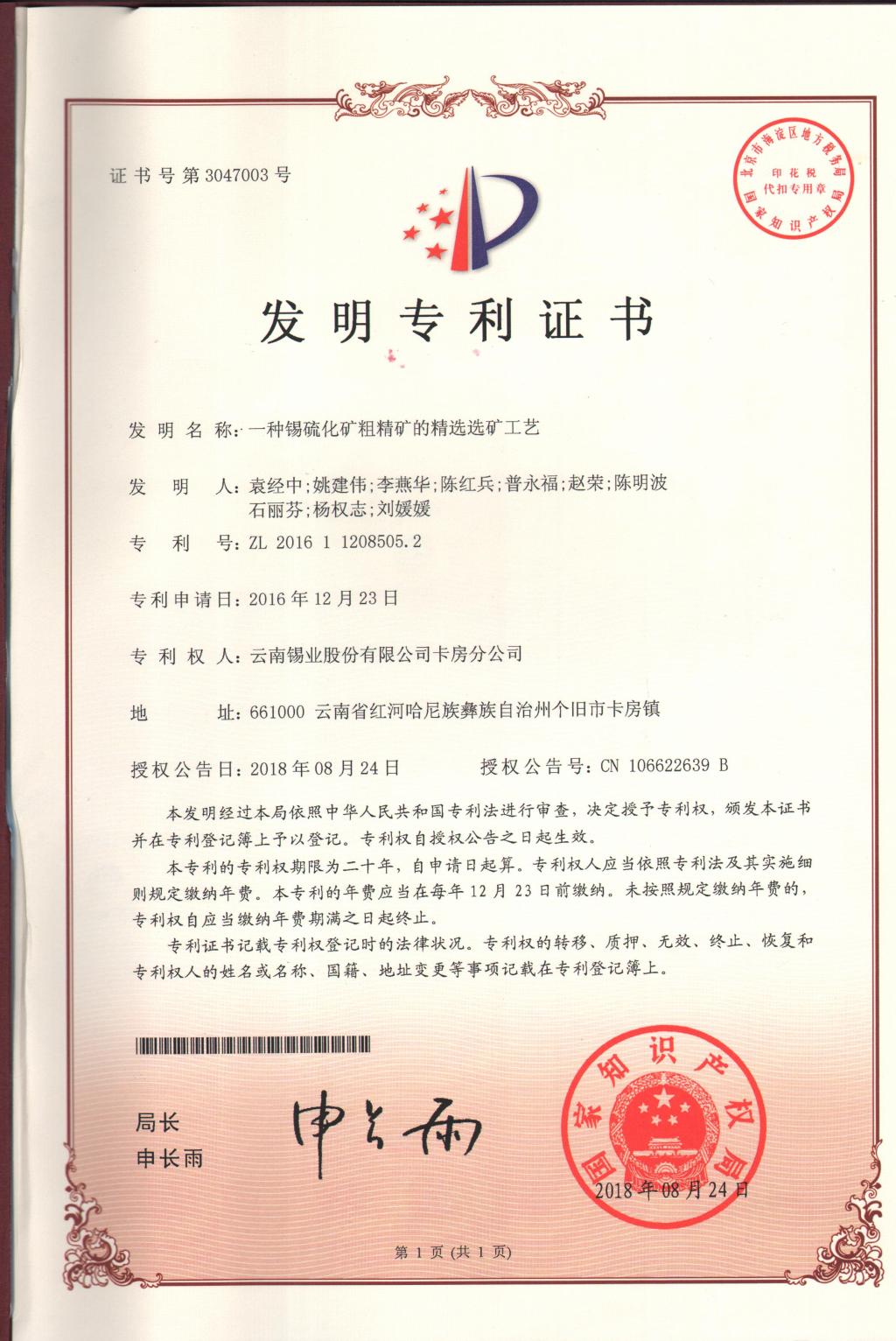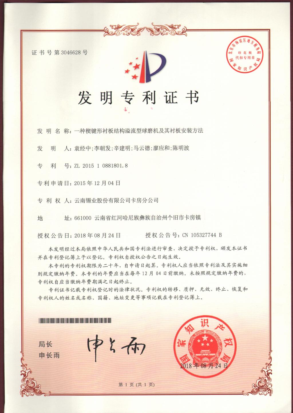 近日,卡房分公司申報(bào)的發(fā)明專(zhuān)利《一種楔鍵形襯板結(jié)構(gòu)溢流型球磨機(jī)及其襯板安裝方法》《一種錫硫化礦粗精礦的精選選礦工藝》再獲國(guó)家知識(shí)產(chǎn)權(quán)局正式授權(quán),并授予國(guó)家發(fā)明專(zhuān)利證書(shū)。這是今年繼8月份該分公司申報(bào)的發(fā)明專(zhuān)利《一種共生硫化礦中富含高砷硫精礦的降砷選礦工藝》《一種皂類(lèi)捕收劑GY-10藥劑溶液的溶解配制方法》獲國(guó)家發(fā)明專(zhuān)利證書(shū)之后,再獲兩項(xiàng)發(fā)明專(zhuān)利授權(quán)。