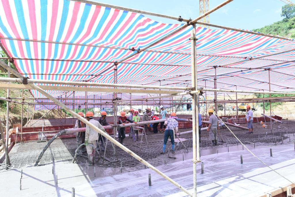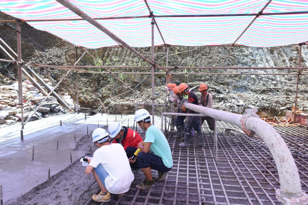 象沖尾礦庫白天高峰時(shí)氣溫接近40攝氏度,熾灼的陽光炙烤著場地的每一個(gè)角落,盡管現(xiàn)場搭起了大棚,但噴灑混凝土的振動(dòng)棒依然被曬得發(fā)燙,作業(yè)人員們手上的塑膠手套換了一雙又一雙,比起高溫的太陽,這里的人們更喜歡月亮,大自然最好的饋贈(zèng)當(dāng)屬夜里送爽的清風(fēng)。由于澆灌需一次成型,60余名作業(yè)人員分為三個(gè)小組24小時(shí)不間斷連續(xù)作業(yè),一張用層板拼接的簡易桌子成為現(xiàn)場指揮、提供補(bǔ)給的港灣,指揮調(diào)度、輪班值守、就餐休息都倚靠這張木桌。佇立的機(jī)車、堅(jiān)定的腳步、忙碌的身影,勾繪出建筑工地上24小時(shí)不停作業(yè)的剪影。