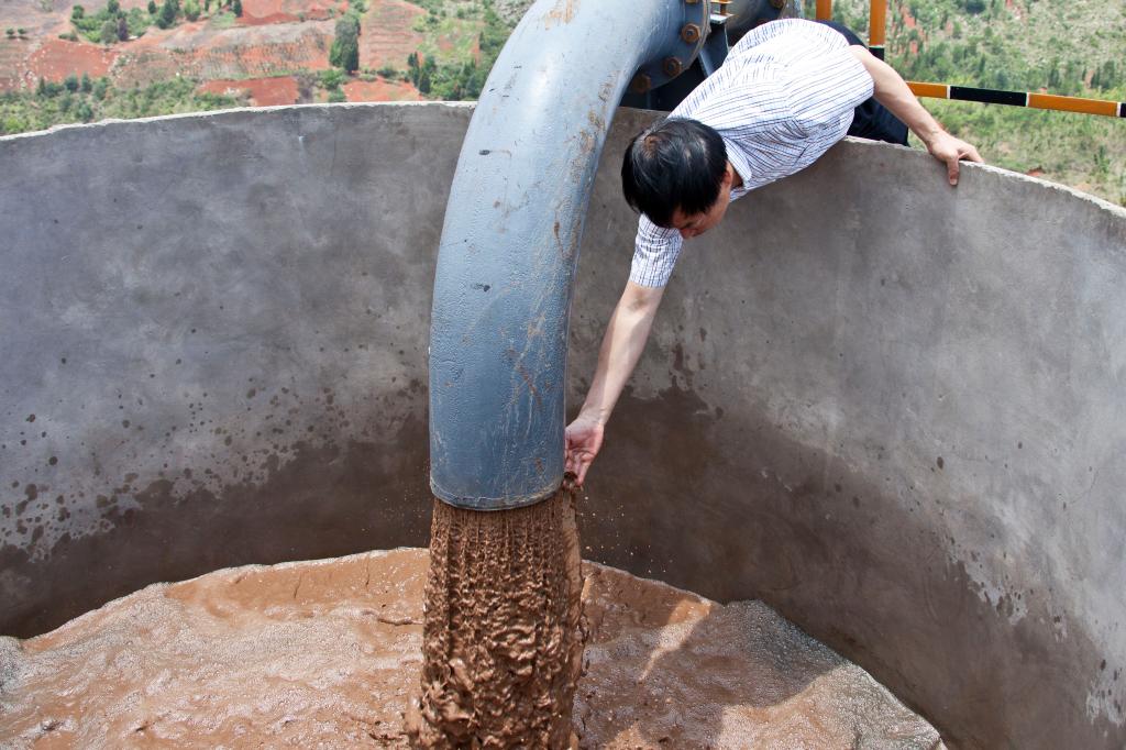 12時40分左右,17米多高的花墳二次濃縮塔緩沖池旁,站滿了施工及前來目睹第一管尾礦輸出的各路人馬,人們默默地屏住呼吸,神色凝重地盯著輸送管的出水口。13時整,輸送管存水由清漸濁,隨著幾聲“撲通、撲通”的聲響,尾礦泥漿以“濃濃”的情意、像帶著人們的重托和長久期盼,由輸送管道遠遠奔騰而來,暢快地一泄而出……