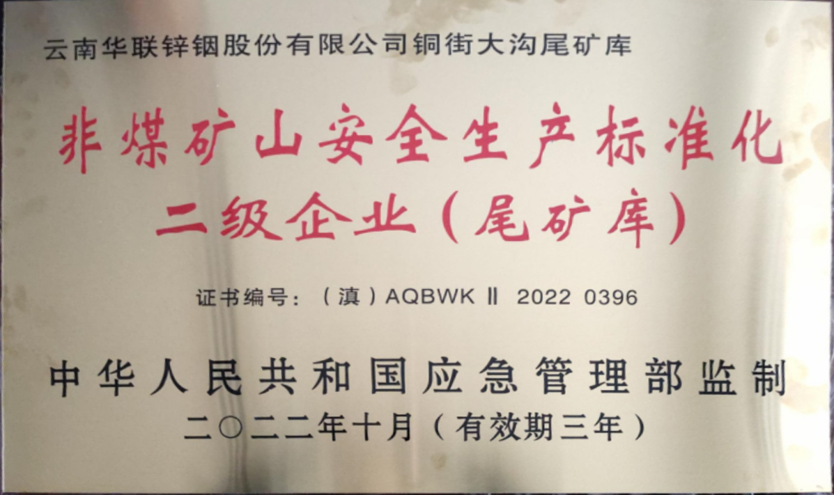 近日,華聯(lián)鋅銦公司銅街大溝尾礦庫、新田尾礦庫順利獲得“非煤礦山安全生產(chǎn)標(biāo)準(zhǔn)化二級企業(yè)”認(rèn)定,并收到由中華人民共和國應(yīng)急管理局監(jiān)制、云南省應(yīng)急管理廳頒發(fā)的牌匾和證書。為進(jìn)一步落實(shí)企業(yè)安全生產(chǎn)主體責(zé)任,華聯(lián)鋅銦公司緊緊圍繞“五個(gè)為零、兩個(gè)確保、一個(gè)不超”的安全生產(chǎn)目標(biāo),嚴(yán)格貫徹落實(shí)《安全生產(chǎn)法》,切實(shí)履行“黨政同責(zé)、一崗雙責(zé)、齊抓共管、失職追責(zé)”的安全生產(chǎn)責(zé)任,通過全員全過程參與,使公司安全生產(chǎn)標(biāo)...